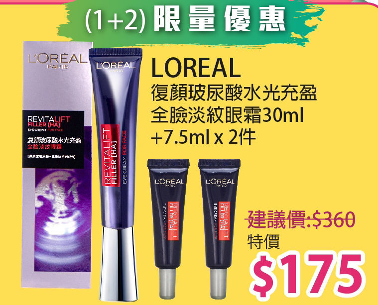 (1+3)L'Oreal Paris RevitaLift 活力緊緻透明質酸 眼霜級全方位淡紋霜 (紫熨斗) 30ml 加送:7.5ml x2件